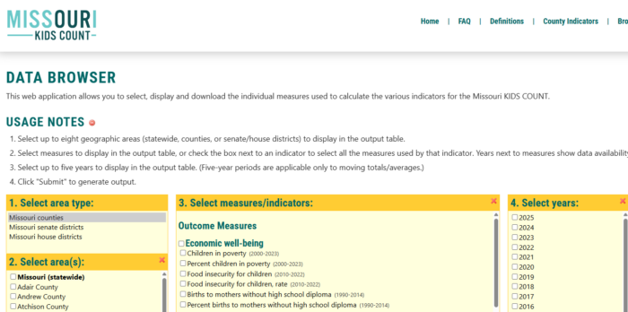 Missouri KIDS COUNT publishes annual data on child well-being using indicators at the county level and a state level. To see your county’s data, try out the new data tools, and to see the best available data and statistics on Missouri’s children over time, visit www.missourikidscountdata.org.